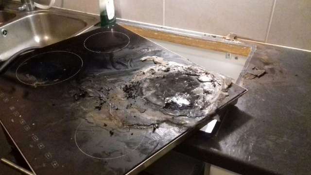 – sähkölaiteviasta syntyneitä katkuja ja hajuja, jotka ovat erittäin vaarallisia (kuvassa liedelle sulanut muoviastia)