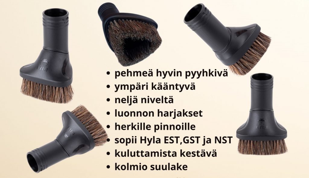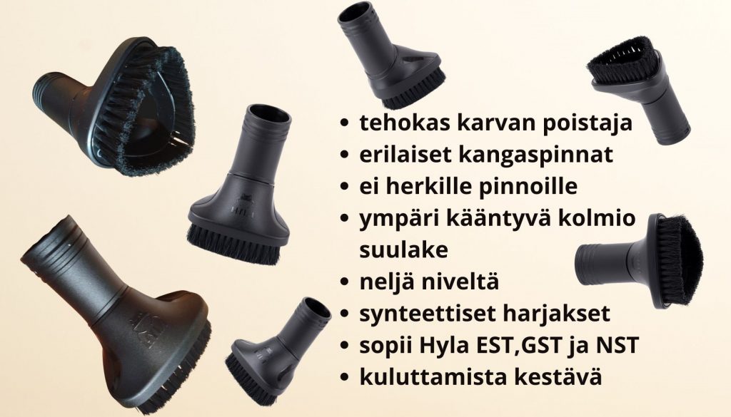 HYLA:n antistaattiset suulakkeet tarjoavat täydellisen yhdistelmän hienovaraista puhdistustehoa ja tarkkuutta. Valittavana on kaksi muotoilua: pyöreä ja kolmiomainen malli. Molemmat suulakkeet on valmistettu luonnollisesta kamelinkarvasta, joka soveltuu erinomaisesti herkkien ja helposti naarmuuntuvien pintojen puhdistamiseen. Molemmat suulakkeet sopivat NST/GST HYLA-malleihin, mutta kolmiosuulake vain EST malliin.