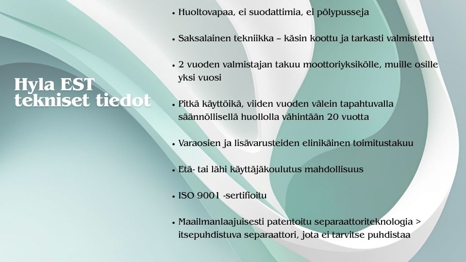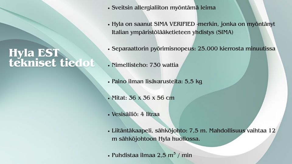 Hyla EST edustaa siivousteknologian uusinta kehitysaskelta. Hyla EST on Hylan tähän mennessä edistynein ilman- ja huoneenpuhdistusjärjestelmä, joka yhdistää tehokkuuden, muotoilun ja kestävyyden ainutlaatuisella tavalla. Uusin Hyla EST -malli hyödyntää vedenpuhdistusteknologiaa erityisesti sitomalla pölyn, allergeenit ja epäpuhtaudet suoraan veteen – ilman pölypusseja, suodattimia tai kemikaaleja.
